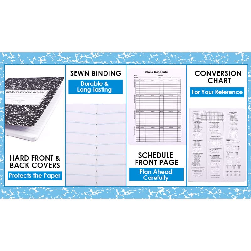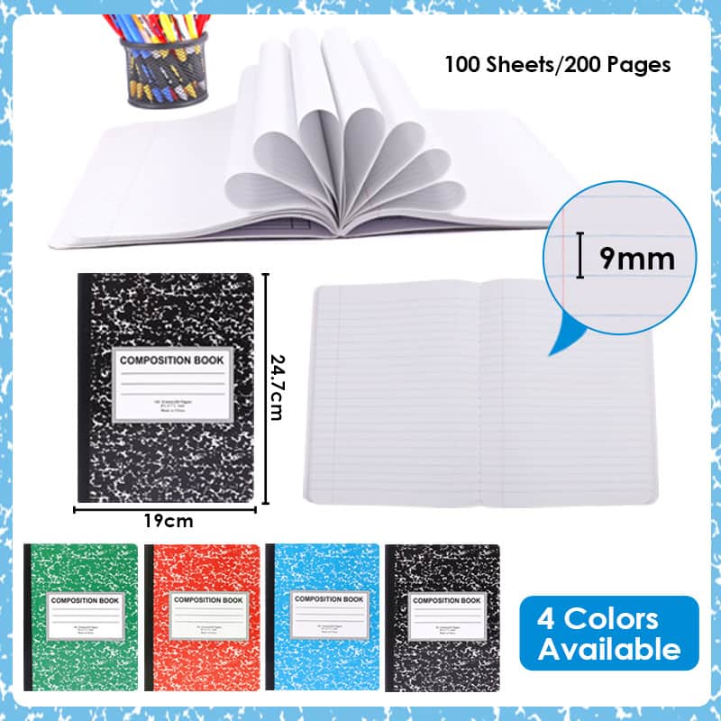 Composition books can be used for various purposes such as note-taking, journaling, sketching, and more. Typically made with sturdy covers and well-bound pages, composition books are durable and can withstand regular use.